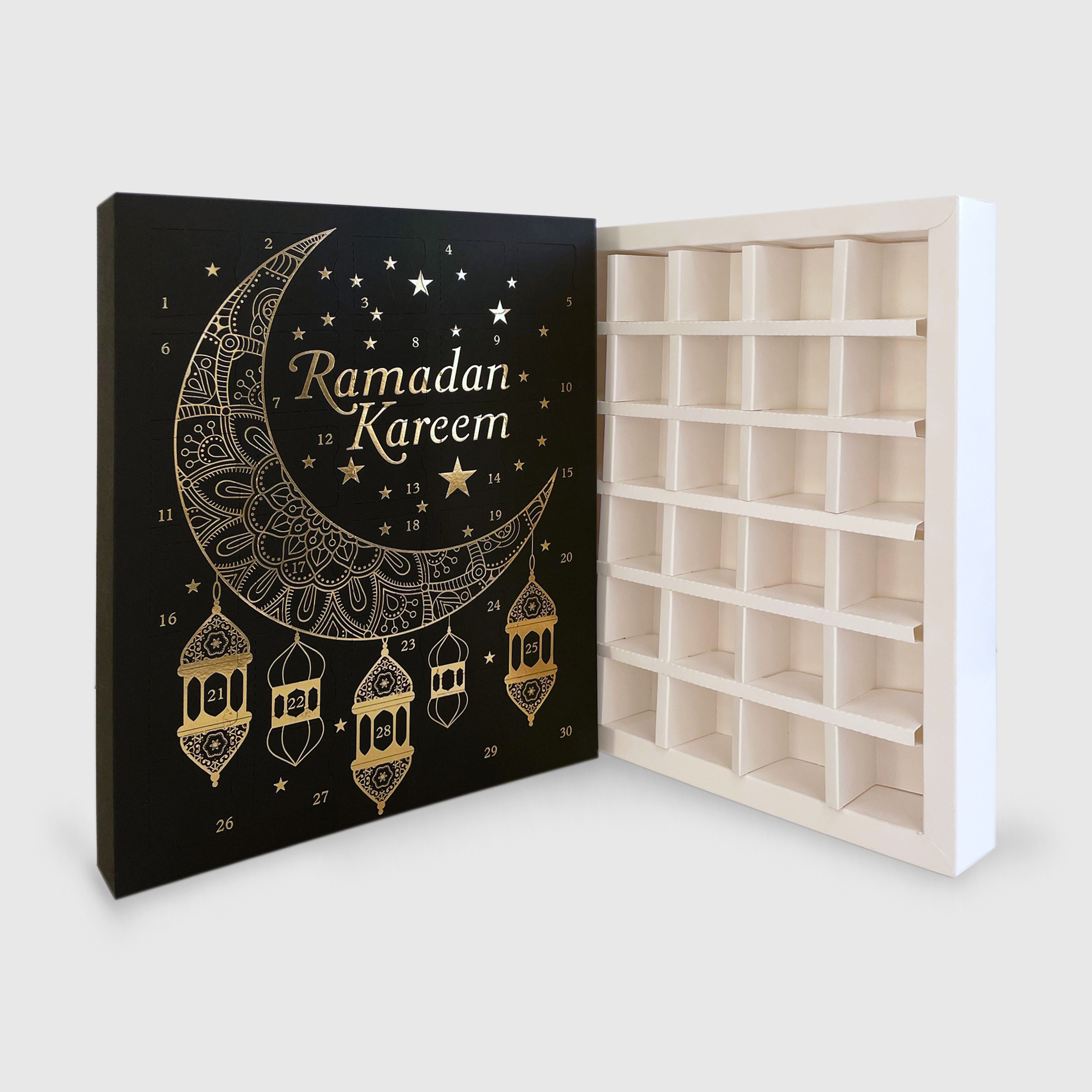 A vibrant new calendar to count down the 30 Days of Ramadan, finished in intricate bright gold foil: Ramadan Kareem (‘Have a generous Ramadan’). It holds a card buffer base and divider in a 5 x 6 orientation. The cavity size is 40 x 40 x 40 mm. Fill with your favourite Halal treats or goodies!